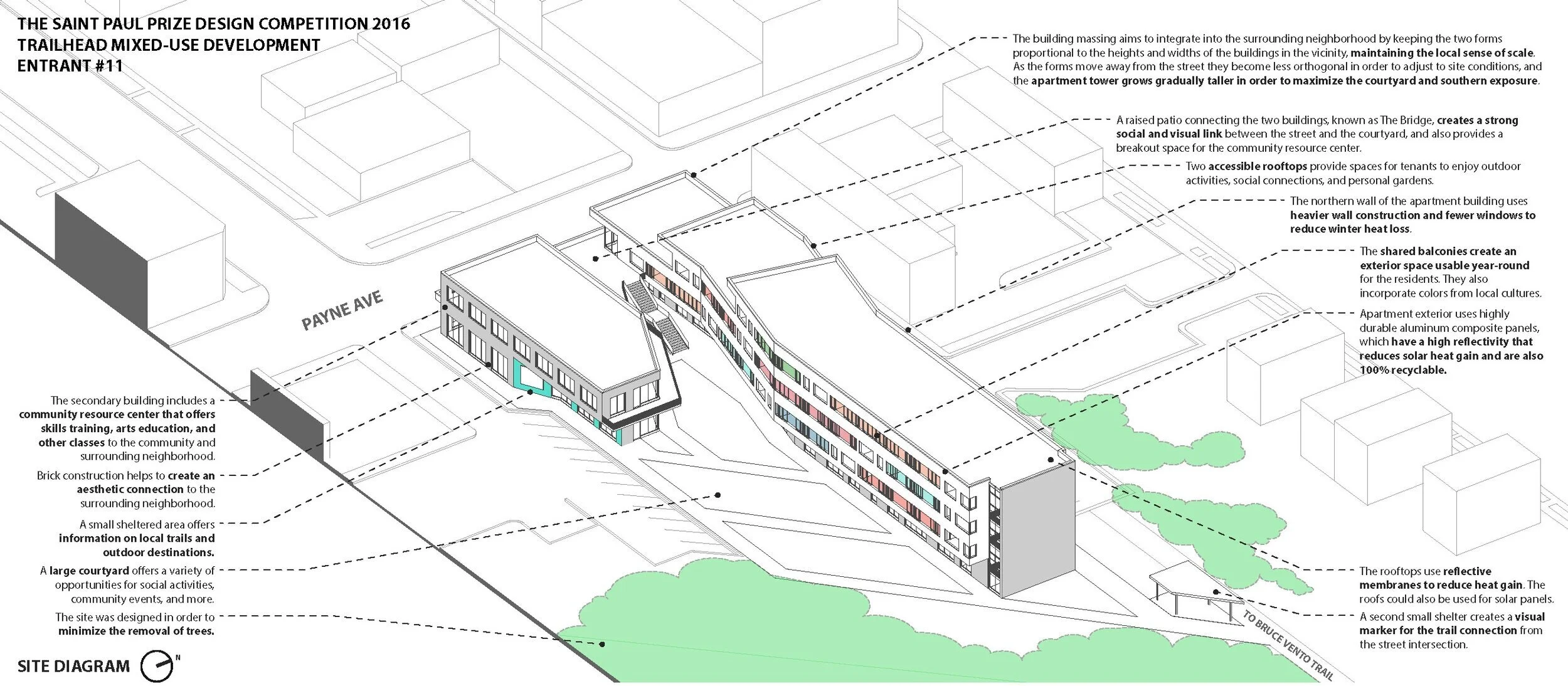 Two week solo design competition for young professionals that challenged us to create a vibrant and exciting mix-used housing solution for the Payne Phalen neighborhood in St Paul. In addition to creating a healthy and nurturing living environment for residents in all life situations, the designs also had to feature prominent connection with a neighboring trailhead, as well as space for local businesses.
